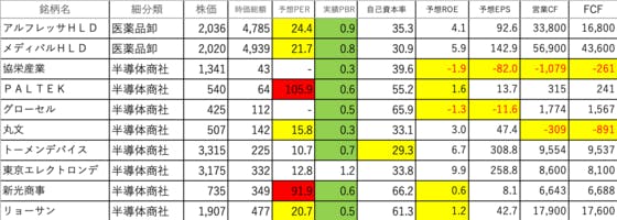 卸売業12です。アルフレッサHLD:PERがやや高いですメディパルHLD:PERがやや高いです協栄産業:ROE、EPS、営業CFとFCFがマイナスPALTEK:PERが異常に高く、ROEが低いグローセル:ROE、EPSがマイナス丸文:PERがやや高く、営業CFとFCFがマイナストーメンデバイス...
