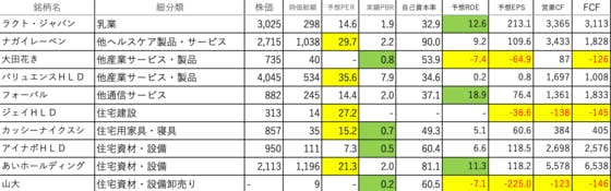卸売業6です。ラクト・ジャパン:ROEがやや高いですナガイレーベン:PERがやや高いです大田花き:ROE、EPS、FCFがマイナスバリュエンスHLD:PERが高いですフォーバル:ROEがやや高いですジェイHLD:PERがやや高く、EPS、営業CFとFCFがマイナスカッシーナイクスシ:PERがや...