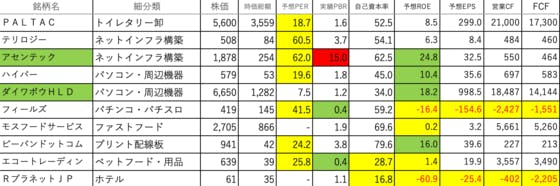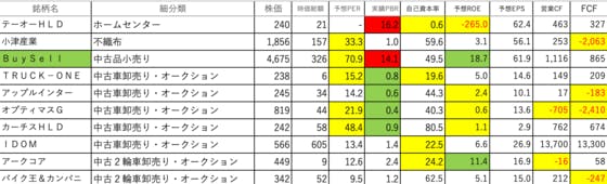 卸売業5です。テーオーHLD:PBRが異常に高く、自己資本率が低く、ROEがマイナス小津産業:PERが高く、FCFがマイナスBuySell:PERが高く、PBRが異常に高く、ROEがやや高いTRUCK-ONE:PERがやや高く、自己資本率が低いアップルインター:ROEが低く、FCFがマイナスオ...