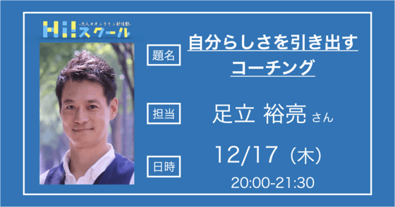 メンバーの皆様、こんにちは!天気予報では、今週から本格的な冬らしいですよ!今でも結構寒いと思うのに、これ以上寒くなるとは。。。皆さんも、体調には気をつけてくださいね!さて、今回は12/17(木)の講座についてのご案内です!講師は足立裕亮さんです。[テーマ]自分らしさを引き出すコーチング[講座概...