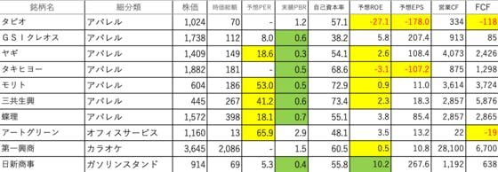 卸売業2です。タビオ:ROE、EPS、FCFがマイナスGSIクレオス:可もなく不可もなくですヤギ:PERがやや高く、自己資本率が低いタキヒヨー:ROE、EPSがマイナスモリト:PERが高く、ROEが低い三共生興:PERが高く、ROEが低い蝶理:PERがやや高いですアートグリーン:PERが高く、...