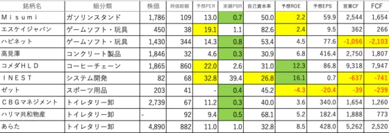 卸売業3です。Misumi:ROEが低いですエスケイジャパン:PERがやや高く、ROEが低いハピネット:営業CFとFCFがマイナス高見澤:可もなく不可もなくですコメダHLD:PERとROEがやや高いINEST:PERが高く、自己資本率が低く、ROEがやや高く、営業CFとFCFがマイナスゼット:...