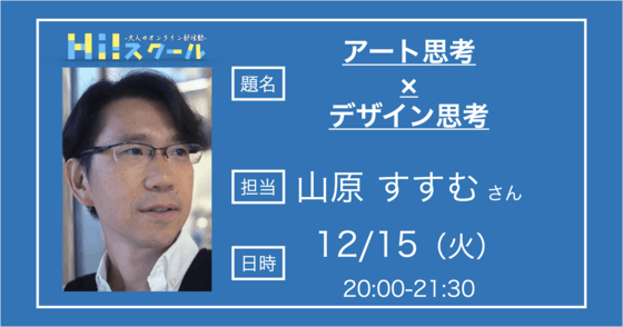 メンバーの皆様、1週間本当にご苦労様でした!金曜日の夜いかがお過ごしでしょうか。さて今回は、12/15(火)の講座についてのご案内です!今回ご登壇いただく講師の方は山原すすむさんです![テーマ]アート思考×デザイン思考[概要]新しいアイデア発想や新規事業、そしてイノベーション創出に有効な、今、...