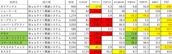情報・通信業49です。ガイアックス:PERがやや高く、営業CFとFCFがマイナスショーケース:PERが異常に高いですエルテス:ROE、EPSがマイナスビープラッツ:PERとPBRが異常に高く、ROEが低く、FCがマイナスシルバーエグテクノ:PERとPBRが異常に高く、FCFがマイナスホットリン...