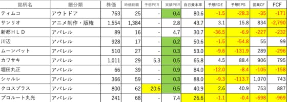卸売業1です。ティムコ:ROE、EPS、営業CFとFCFがマイナスサンリオ:FCFがマイナス新都HLD:ROE、EPS、営業CFとFCFがマイナス川辺:ROE、EPSがマイナスムーンバット:ROE、EPS、FCFがマイナスカワサキ:可もなく不可もなくです堀田丸正:ROE、EPS、営業CFとFC...