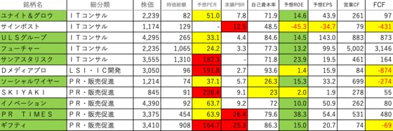 情報・通信業48です。ユナイト&グロウ:PERが高く、ROEがやや高いサインポスト:PBRが異常に高く、ROE、EPS、FCFがマイナスULSグループ:PERが高く、ROEがやや高いフューチャー:PERとROEがやや高いサンアスタリスク:PERが異常に高く、ROEがやや高いDメディアプロ:PE...