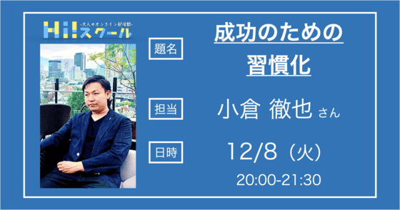コミュニティメンバーの皆さん、こんにちは!マネージャーのそーいちです!今回は今日の夜20:00-の講座についてのインフォメーションです!今夜の講師は小倉徹也さんです。[テーマ]成功のための習慣化[講座概要]成功とは何か?そして成功するために必要なものは何か?その原理原則を一緒に考えていきましょ...