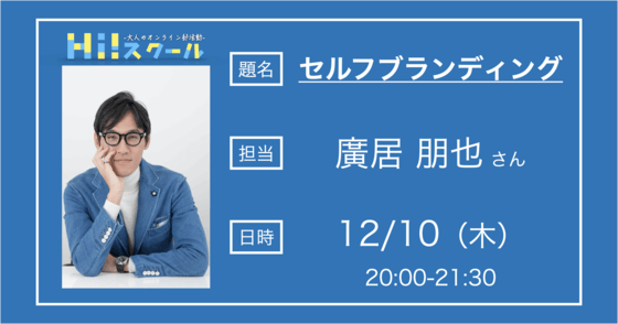 メンバーの皆様、こんにちは!最近気温がグッと冷え込んできていますね。。。お身体変わりないでしょうか?さて今回は、12/10(木)20:00-21:30の講座の内容についてお伝えいたします。講師は廣居朋也さんです!以下にテーマと講座概要を記載します![テーマ]セルフブランディング[講座概要]今こ...