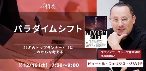◎当日のコンテンツ【朝渋】×【ペアドク】コラボ企画!ピョートル・フェリクス・グジバチ氏の新刊『パラダイムシフト 新しい世界をつくる本質的な問いを議論しよう』を題材に、朝は朝渋、夜はペアドクにてイベントを開催します。『パラダイムシフト 新しい世界をつくる本質的な問いを議論しよう』は、「これからの...