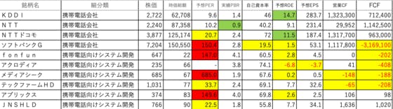 情報・通信業38です。KDDI:ROEがやや高いですNTT:可もなく不可もなくですNTTドコモ:PERとROEがやや高いソフトバンクG:PERが異常に高く、自己資本率が低く、ROEが低く、FCFがマイナスfonfun:PERが異常に高く、ROEが低く、FCFがマイナスアクロディア:ROE、EP...
