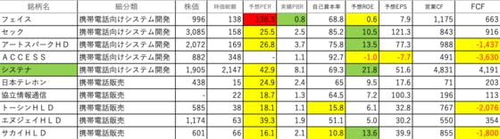 情報・通信業39です。フェイス:PERが異常に高く、ROEが低いセック:PERとROEがやや高いアートスパークHD:PERとROEがやや高く、FCFがマイナスACCESS:ROE、EPS、FCFがマイナスシステナ:PERが高く、ROEがやや高い日本テレホン:PERがやや高いです協立情報通信:P...