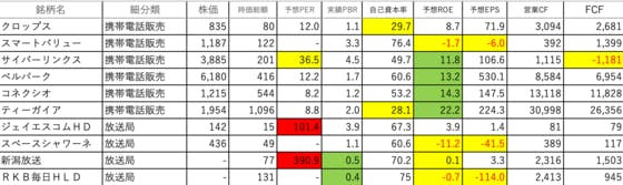 通信・情報業40です。クロップス:自己資本率が低いですスマートバリュー:ROE、EPSがマイナスサイバーリンクス:PERが高く、ROEがやや高く、FCFがマイナスベルパーク:ROEがやや高いですコネクシオ:ROEがやや高いですティーガイア:自己資本率が低く、ROEがやや高いジェイエスコムHD:...