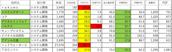 情報・通信業17です。rakumo:PERが異常に高いですシステムサポート:PERが高く、ROEがやや高いコア:PERとROEがやや高いデジタルインフォT:PERとROEがやや高いバルテス:PERが高く、PBRが異常に高く、ROEがやや高いキューブシステム:PERが高く、ROEがやや高いビジネ...