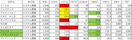 情報・通信業18です。イーソル:PERが異常に高いですジャステック:PERがやや高いですアイティフォー:PERとROEがやや高いCAC HLD:PERがやや高いですティアンドエス:PERが異常に高く、ROEも高いNSW:ROEがやや高いですALBERT:PERとPBRが異常に高いクレスコ:RO...