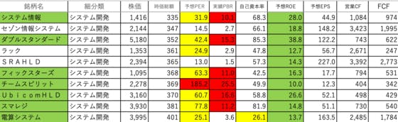 情報・通信業19です。システム情報:PERとROEが高く、PBRが異常に高いセゾン情報システム:ROEがやや高いですダブルスタンダード:PERとROEが高く、PBRが異常に高いラック:PERとROEがやや高いSRAHLD:ROEがやや高いですフィックスターズ:PERが高く、ROEがやや高く、P...