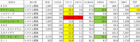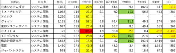 情報・通信業15です。日本システム技術:PERがやや高く、FCFがマイナスIX・ナレッジ:PERとROEがやや高いアクシス:PERが高いですヴィッツ:PERが高く、ROEがやや高い東邦システムサイエ:PERがやや高いですCAICA:PERが異常に高く、ROEが低く、営業CFとFCFがマイナスY...