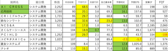 情報・通信業14です。AI CROSS:PERが高く、ROEがやや高い応用技術:PERとROEがやや高いCRIミドルウェア:PERがやや高いです鈴与シンワート:PERが高く、自己資本率が低く、ROEがやや高いNCS&A:PERがやや高いですさくらケーシーエス:PERがやや高いですPCIHLD:...