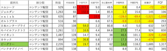 情報・通信業⑤です。コムシード:PERが異常に高く、ROEが低く、営業CFとFCFがマイナスジョルダン:PERが異常に高く、ROEが低いenish:PBRが異常に高く、ROE、EPS、営業CFとFCFがマイナスオルトプラス:ROE、EPS、営業CFがマイナス日本エンタープライ:PERが高いです...