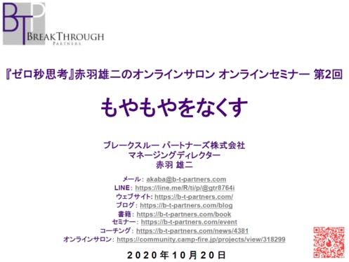 今回は、「もやもやをなくす」というテーマでいろいろな方向からお話をし、多数の質疑応答をさせていただきました。もやもやをなくすことは実はそれほどむずかしいことではありません。なぜもやもやするのかを理解し、A4メモ書きをある程度続けていると、いつのまにか、もやもやすることがなくなっていきます。内容...