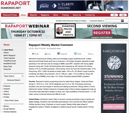 今週もラパポートウィークリーマーケットコメントからお送りしています。休日の注文と不足が研磨済ダイヤモンド価格をサポートするにつれて、市場のムードは良くなっています。NRFによると(NRFとは、米国における小売業界の団体のことであり、会員数約160万社という世界最大の小売業界団体となっている。百...