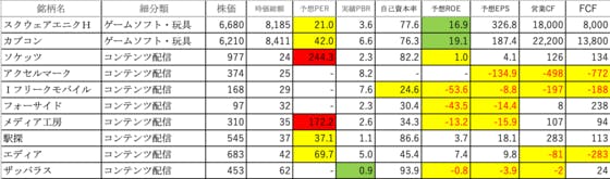 情報・通信業④です。スクウェアエニクH:PERとROEがやや高いカプコン:PERが高く、ROEがやや高いソケッツ:PERが異常に高く、ROEが低いアクセルマーク:EPS、営業CFとFCFがマイナスIフリークモバイル:自己資本率が低く、ROE、EPS、営業CFとFCFがマイナスフォーサイド:RO...