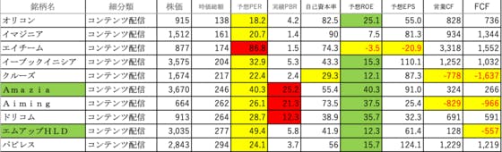 情報・通信業⑥です。オリコン:PERがやや高く、ROEが高いイマジニア:PERがやや高いですエイチーム:PERが異常に高く、ROE、EPSがマイナスイーブックイニシア:PERが高く、ROEがやや高いクルーズ:PERがやや高く、自己資本率が低く、ROEがやや高く、営業CFとFCFがマイナスAma...