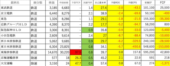 陸運業④です。東武鉄道:自己資本率が低く、ROE、EPSがマイナス京王電鉄:ROE、EPS、FCFがマイナス東急:自己資本率が低く、ROE、EPS、FCFがマイナス近鉄グループHLD:自己資本率が低く、ROE、EPSがマイナス阪急阪神HLD:ROE、EPS、FCFがマイナス小田急電鉄:自己資本...