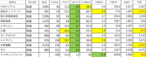 陸運業⑤です。日本ロジテム:自己資本率が低いです東部ネットワーク:ROEが低く、FCFがマイナス岡山県貨物運送:可もなく不可もなくです南総通運:可もなく不可もなくですヒガシ21:可もなく不可もなくです丸運:PERがやや高く、ROEが低く、FCFがマイナスカンダHLD:可もなく不可もなくですエス...