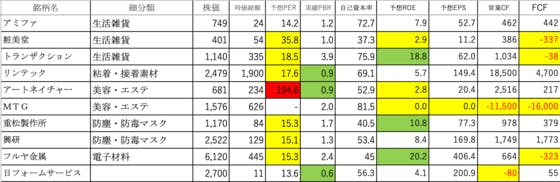 その他製品⑩です。アミファ:可もなく不可もなくです粧美堂:PERが高く、ROEが低く、FCFがマイナストランザクション:PERとROEがやや高く、FCFがマイナスリンテック:PERがやや高いですアートネイチャー:PERが異常に高く、ROEが低いMTG:ROEとEPSが0で、営業CFとFCFがマ...