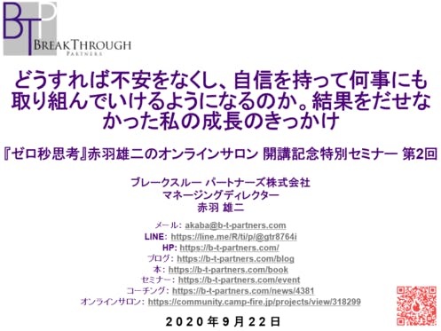 『ゼロ秒思考』赤羽雄二のオンラインサロンの10月からの開講にあたり、9/22(火)20:00-21:00には、メンバー限定の特別セミナー第2回を開催しました。https://community.camp-fire.jp/projects/view/318299テーマは、「どうすれば不安をなくし...
