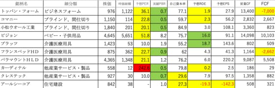 その他製品③です。トッパン・フォーム:PERが高く、ROEが低く、FCFがマイナスコマニー:PERがやや高く、ROEが低い小松ウオール工業:PERがやや高いですピジョン:PERが高く、ROEがやや高いプラッツ:ROEがやや高いですフランスベッドHD:PERがやや高く、FCFがマイナスパラマウン...