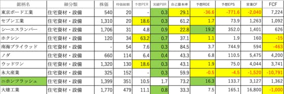 その他製品④です。東京ボード工業:自己資本率が低く、ROE、EPS、営業CFがマイナスセブン工業:PERがやや高く、ROEが低いシーエスランバー:自己資本率が低く、ROEが高いホクシン:PERが高く、ROEが低く、FCFがマイナス南海プライウッド:FCFがマイナスノダ:可もなく不可もなくですウ...