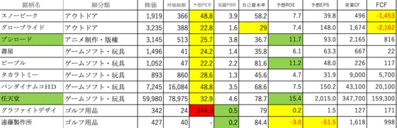 その他製品①です。スノーピーク:PERが高く、FCFがマイナスグローブライド:PERがやや高く、自己資本率が低く、FCFがマイナスブシロード:PERとROEがやや高い壽屋:PERがやや高いですピープル:PERとROEがやや高いタカラトミー:PERがやや高いですバンダイナムコHD:PERが高いで...