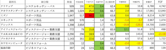 その他製品②です。クリナップ:PERが高く、ROEが低いタカラスタンダード:PERがやや高く、ROEが低いミズノ:PERが異常に高く、ROEが低いヨネックス:ROE、EPSがマイナスアシックス:ROE、EPSがマイナスアイフィスジャパン:PERとROEがやや高いTAKARA&CO:PERがやや...