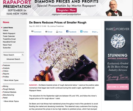 ラパポートニュースより。デビアスは、先週から始まった好調な販売の勢いが今週も続いているため、原石ダイヤモンドの価格を1カラット未満に引き下げたと、語りました。デビアスとライバルのアルローザは、在庫の切り下げを避けるために、価格を下げずになるべく維持していました。危機の間に落ち込んでいた研磨済ダ...