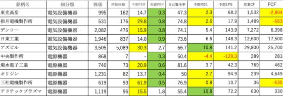 電気機器22です。東光高岳:ROEが低く、FCFがマイナス指月電機製作所:PERがやや高く、ROEが低く、FCFがマイナスデンヨー:PERがやや高いです日東工業:可もなく不可もなくですアズビル:PERが高く、ROEがやや高い中央製作所:ROE、EPSがマイナス菊水電子工業:PERがやや高いです...