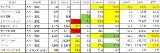 電気機器23です。オンキヨー:自己資本率が低く、ROE、EPS、営業CFとFCFがマイナスツインバード工業:ROEが低いです船井電機:ROEが低いですJVCケンウッド:PERが異常に高く、自己資本率とROEが低い象印マホービン:PERが高いですカシオ計算機:PERが異常に高いですシャープ:自己...