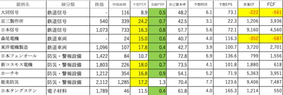 電気機器16です。大同信号:営業CFとFCFがマイナスです京三製作所:PERがやや高いです日本信号:PERがやや高いです森尾電機:PERがやや高く、営業CFとFCFがマイナス東洋電機製造:PERがやや高いです日本フェンオール:可もなく不可もなくです新コスモス電機:PERがやや高いですホーチキ:...