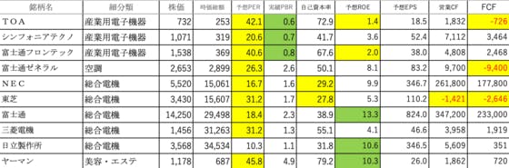 電気機器13です。TOA:PERが高く、ROEが低く、FCFがマイナスシンフォニアテクノ:PERがやや高いです富士通フロンテック:PERが高く、ROEが低い富士通ゼネラル:PERがやや高く、FCFがマイナスNEC:PERがやや高く、自己資本率が低い東芝:PERが高く、自己資本率が低く、営業CF...