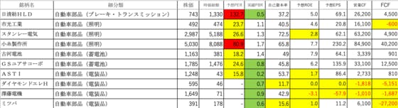 電気機器14です。日清紡HLD:PERが異常に高いです市光工業:PERがやや高く、FCFがマイナススタンレー電気:PERがやや高く、ROEが低い小糸製作所:PERが異常に高いです古河電池:PERがやや高いですGSユアサコーポ:PERがやや高いですASTI:PERがやや高く、ROEが低いダイヤモ...