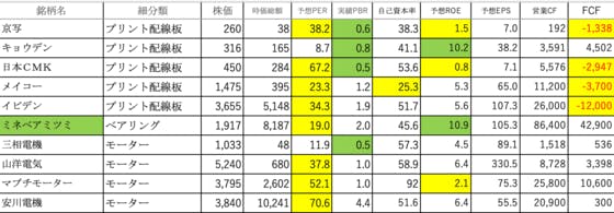 電気機器⑤です。京写:PERが高く、ROEが低く、FCFがマイナスキョウデン:ROEがやや高いです日本CMK:PERが高く、ROEが低く、FCFがマイナスメイコー:PERがやや高く、自己資本率が低く、FCFがマイナスイビデン:PERが高く、FCFがマイナスミネベアミツミ:PERとROEがやや高...