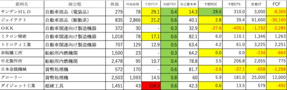 機械18です。サンデンHLD:PERとROEがやや高く、自己資本率が低く、FCFがマイナスジェイテクト:PERがやや高く、ROEが低く、FCFがマイナスOKK:ROE、EPS、営業CFとFCFがマイナスミクロン精密:PERがやや高いですトリニティ工業:可もなく不可もなくです赤阪鐵工所:ROEが...