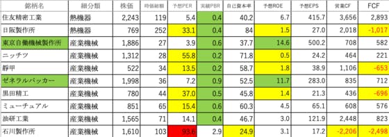 機械15です。日本ピラー工業:可もなく不可もなくですホソカワミクロン:PERがやや高いです不二越:PERが異常に高いですCKD:PERが高いですナブテスコ:PERとROEがやや高い高見沢サイバネティ:PERがやや高く、自己資本率が低い兼松エンジニア:ROEがやや高いですアイチコーポ:可もなく不...