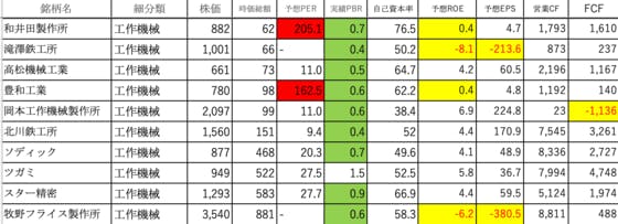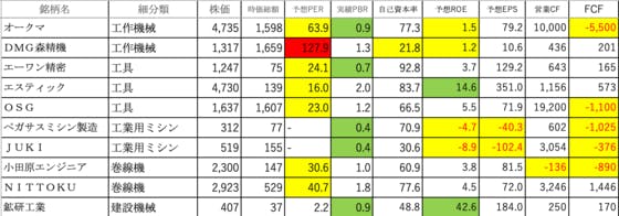 機械⑩です。オークマ:PERが高く、ROEが低く、FCFがマイナスDMG森精機:PERが異常に高く、自己資本率とROEが低いエーワン精密:PERがやや高いですエスティック:PERとROEがやや高いOSG:PERがやや高く、FCFがマイナスペガサスミシン製造:ROE、EPS、FCFがマイナスJU...