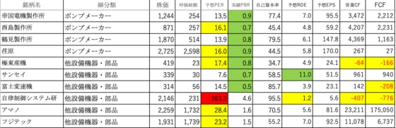 機械⑤です。帝国電機製作所:可もなく不可もなくです酉島製作所:PERがやや高いです鶴見製作所:可もなく不可もなくです荏原:PERがやや高いです極東産機:PERがやや高く、営業CFとFCFがマイナスサンセイ:ROEがやや高いです富士変速機:FCFがマイナスです自律制御システム研:PERが異常に高...