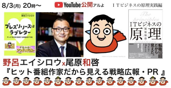 放送作家 PR戦略コンサルタントの野呂エイシロウさんと「戦略広報、PR」を深掘ります!8/ 3(月)20:00-21:30「天才たけしの元気が出るテレビ」「鉄腕DASH」「奇跡体験アンビリバボー」などの放送作家でありながら放送作家として培ったテレビ番組をヒットさせるノウハウを、企業広報に生かす...
