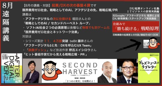【8月の講義・対談】起業/DXの次の基盤4講です 限界費用ゼロ社会、戦略としてのAI、野呂エイシロウさん戦略広報/PR、アフデジ2の先藤井さん