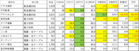 非鉄金属②です。アサカ理研:ROEとEPSがマイナス中外鉱業:PERが高く、ROEが低いアサヒHLD:ROEが高く、営業CFとFCFがマイナス東邦金属:ROE、EPS、FCFがマイナスタツタ電線:PERがやや高いです三井金属:PERがやや高いです三ッ星:ROEが低く、FCFがマイナスJMACS...