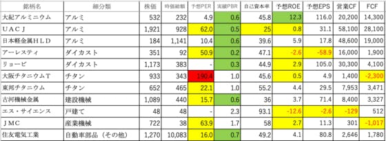 非鉄金属①です。大紀アルミニウム:ROEがやや高いですUACJ:PERが高く、自己資本率とROEが低い日本軽金属HLD:可もなく不可もなくですアーレスティ:PERが高く、ROE、EPSがマイナスリョービ:ROEが低いです大阪チタニウムT:PERが異常に高く、ROEが低く、FCFがマイナス東邦チ...