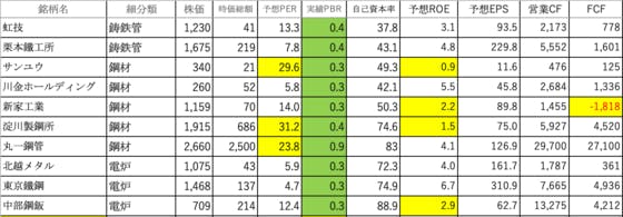 鉄鋼④です。虹技:可もなく不可もなくです栗本鐵工所:可もなく不可もなくですサンユウ:PERがやや高く、ROEが低い川金ホールディング:可もなく不可もなくです新家工業:ROEが低く、FCFがマイナス淀川製鋼所:PERがやや高く、ROEが低い丸一鋼管:PERがやや高い北越メタル:可もなく不可もなく...
